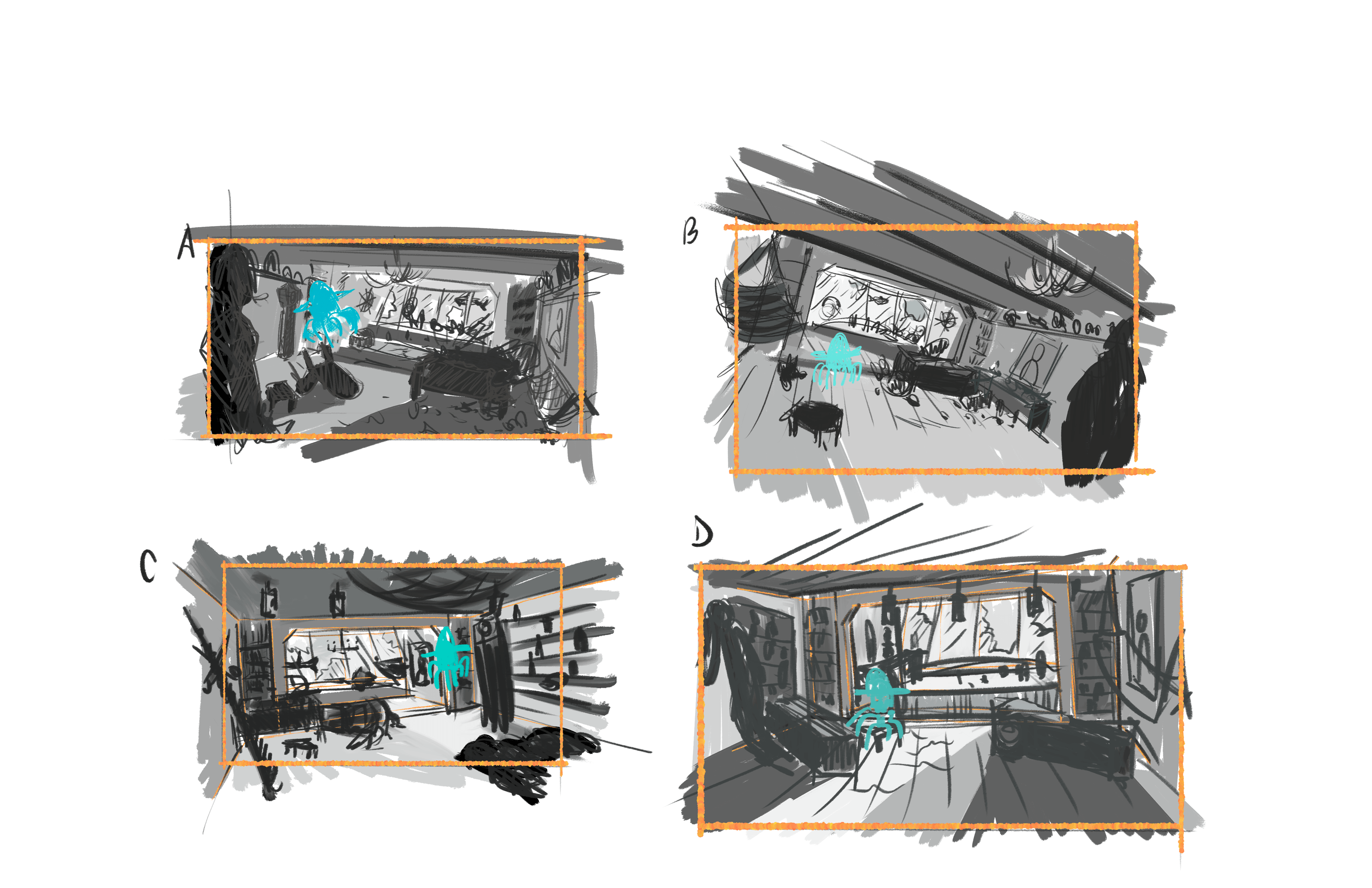 I agree that it feels claustrophobic, so I'm going to really work on using values to "hide" things in the shadows and make the focus more on the main character, so that viewer has to seek out the other objects.