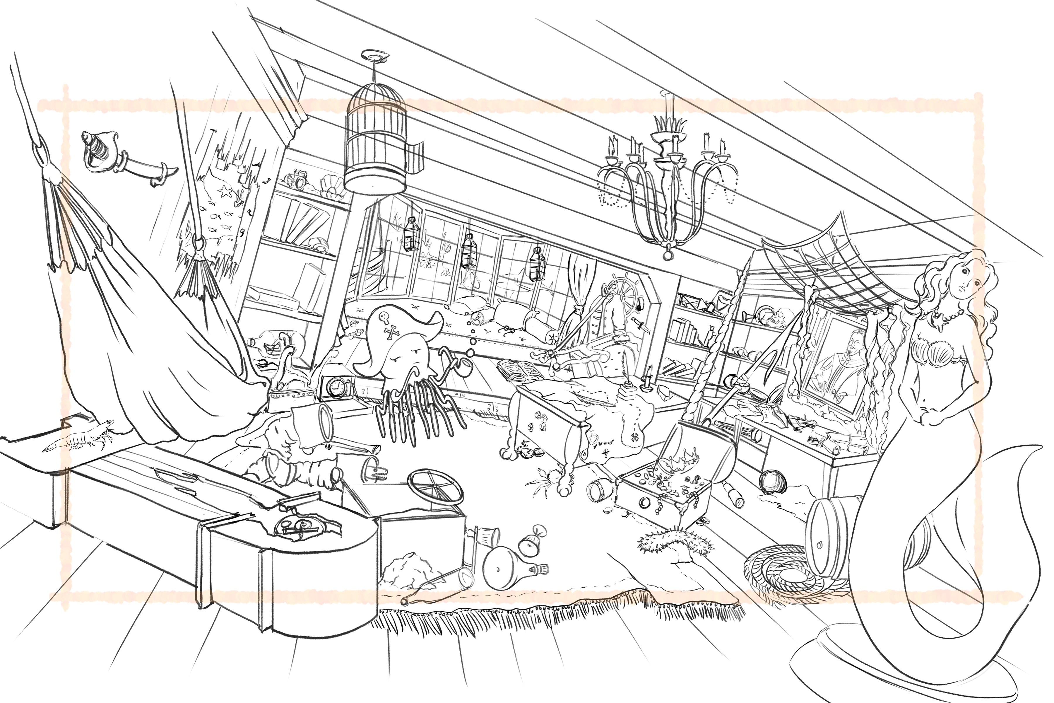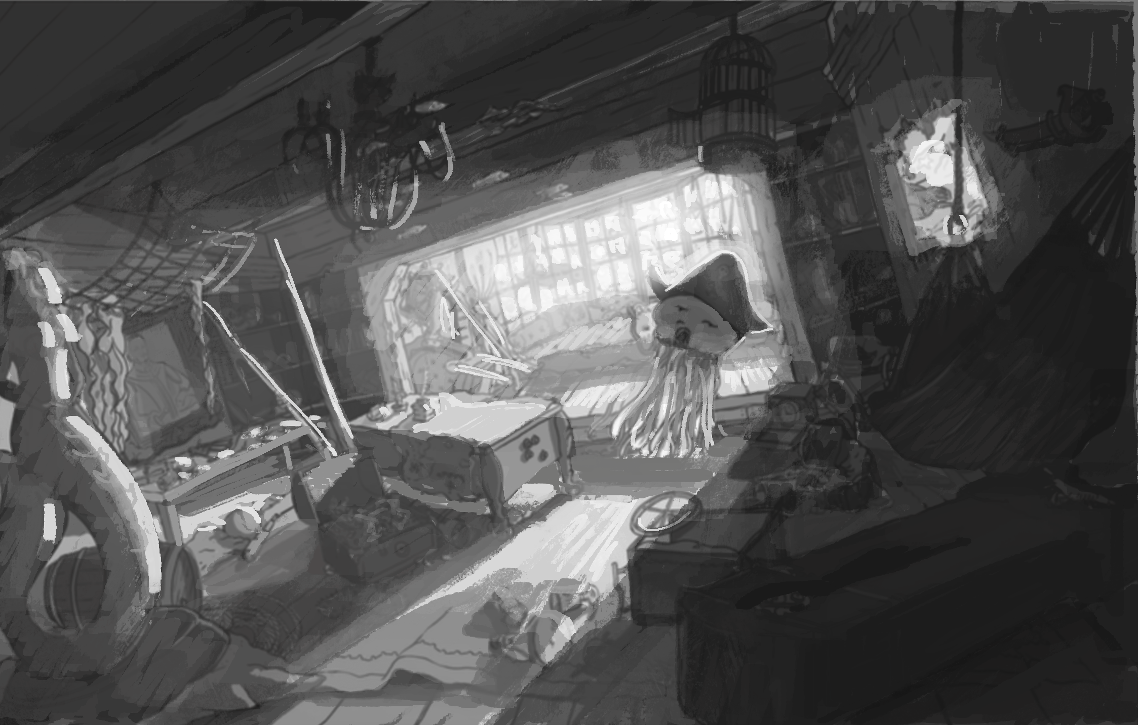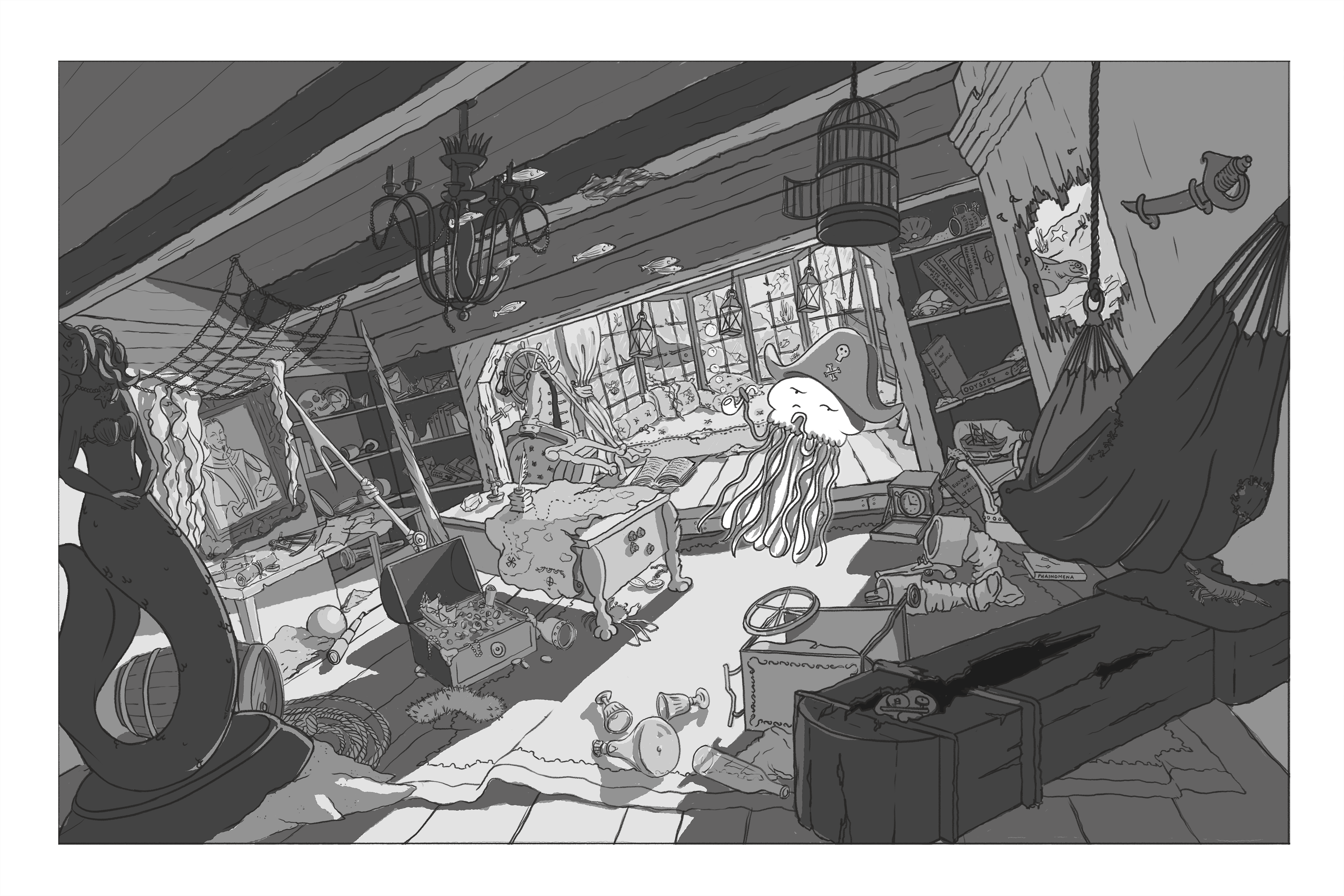 My concept takes place in a captain's cabin of a sunken ship (maybe a pirate ship?). A small jellyfish character has discovered the captain's hat, and is proudly masquerading as the new captain.