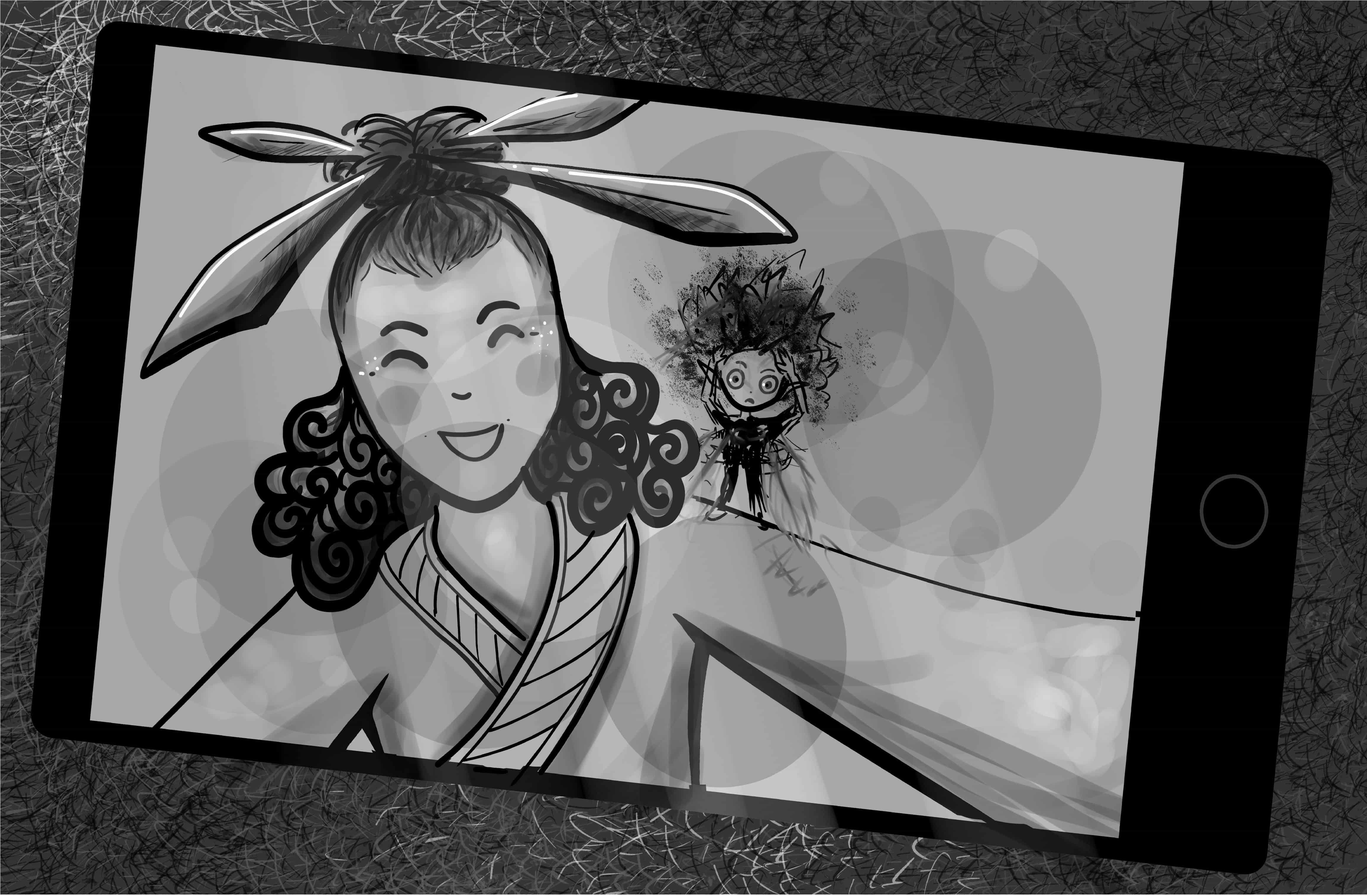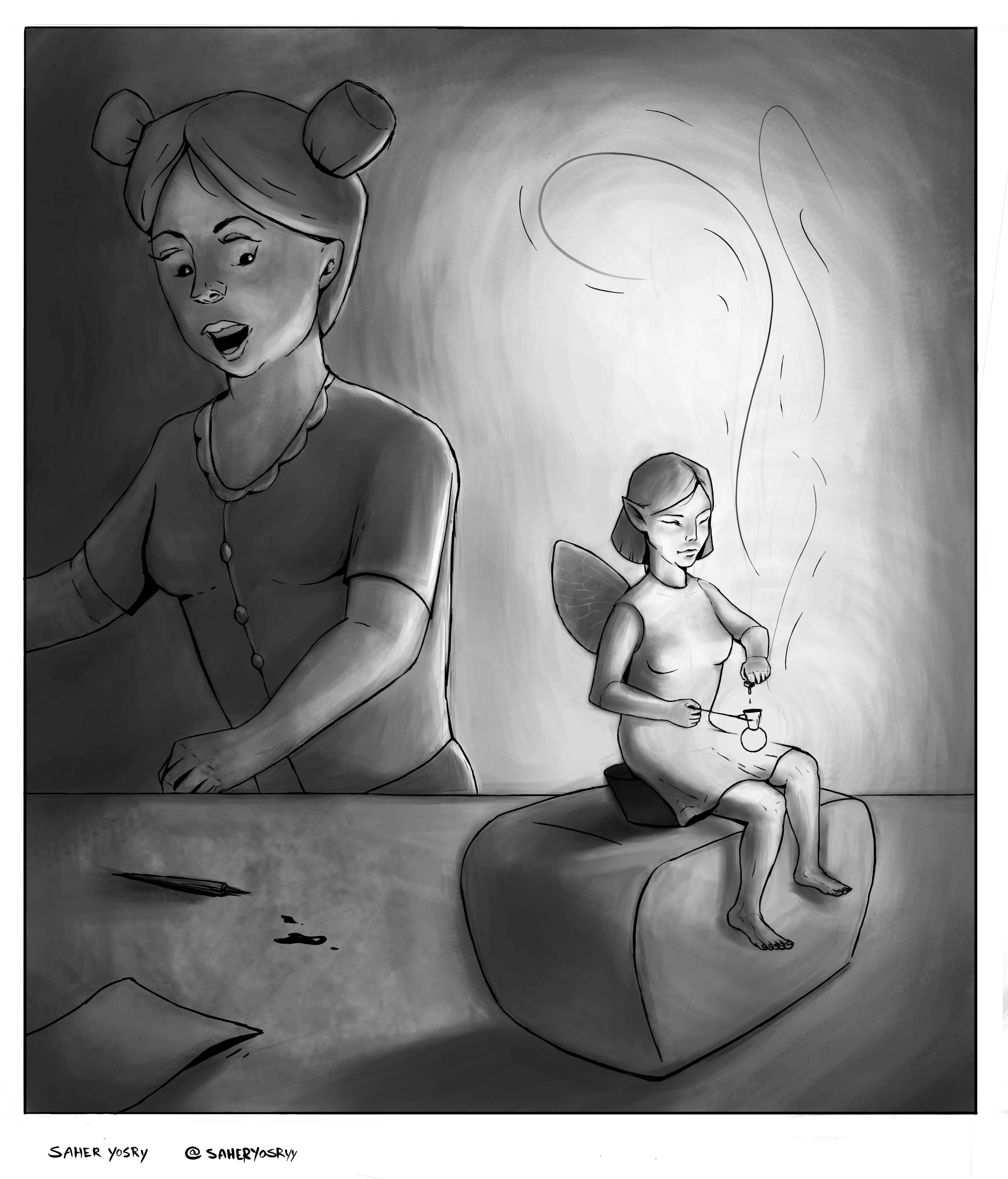Ellie first saw an Ink Fairy when she was 4. No one believed her. For years she tried to prove it. She couldn't see them again but she would feel their presence when drawing. They were always behind her. She couldn't snap a photo until selfie cameras were invented. She closed her eyes and the Ink Fairy appeared.