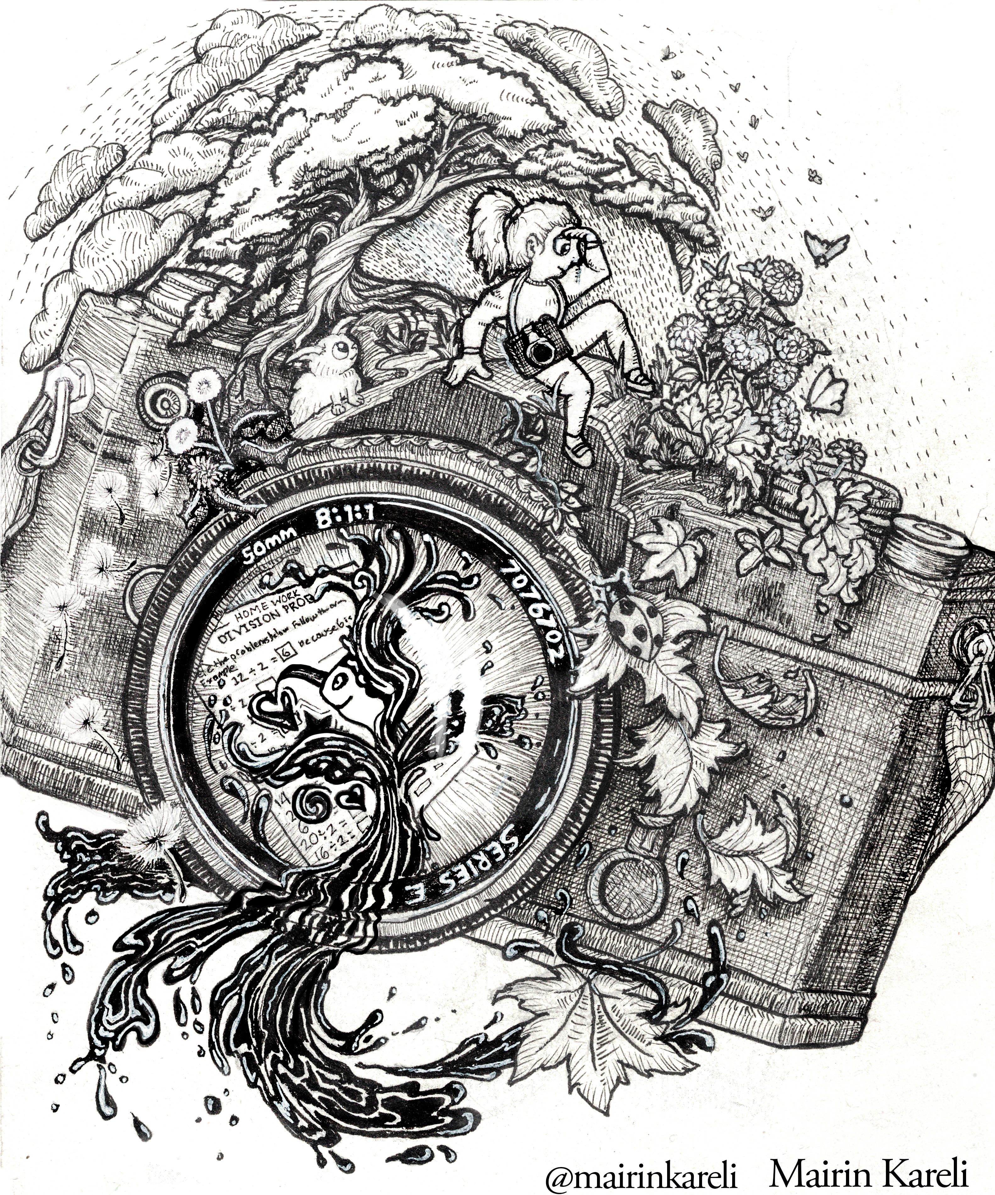 I had fun experimenting with some different kinds of inking(ink pens and indonesian ink), but the final result is edited digitally so it's become a mixed media thing. I hope that's okay!