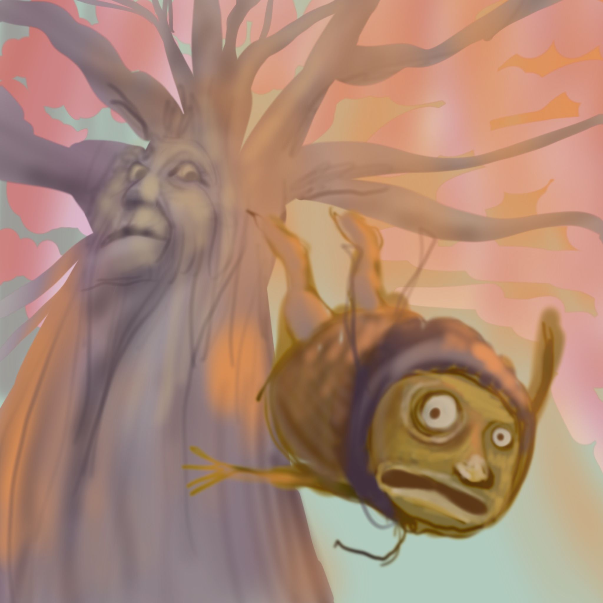 @allysa this is surely a more dynamic angle! The tree now looks a bit scared though as if afraid to loose it's acorns instead of smiling benevolently (not a word probably) knowing this falling acorn is growing into a new tree. The worried man made me laugh, it does now seem like it has arms and legs? Love to see it in it's next phase. I'm struggling along with my own wip, always comforting to know others are working on theirs.