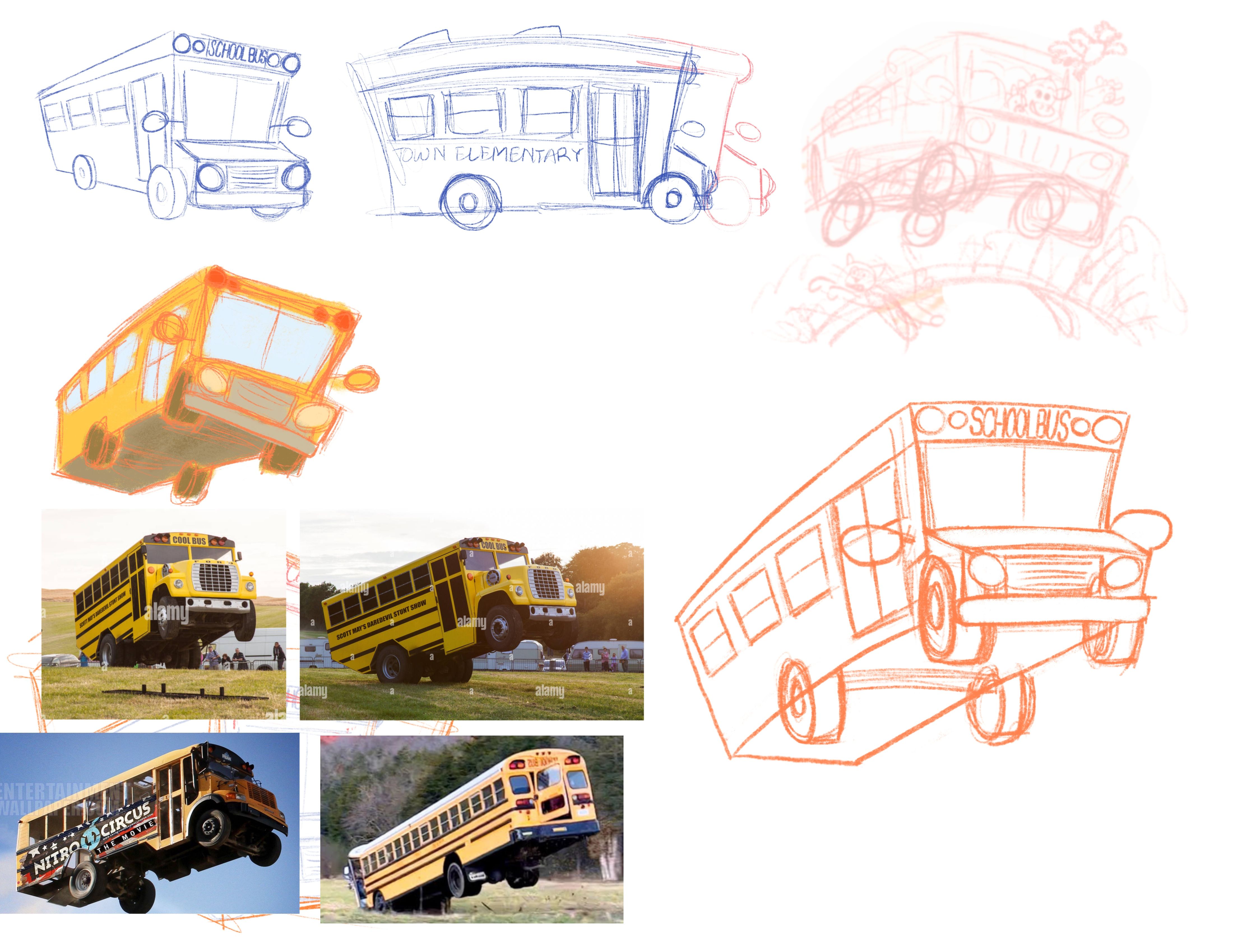 @kayleenartlover I love how this is going, and it is hysterical that you found so many pictures of buses getting air! I had a thought about the teachers and students, if you are still brainstorming a plausible distraction. Maybe they all got out to take a picture with the scenery or some landmark of educational value, and are standing facing away from the bus. The photographer is the only one who is facing it but might not even notice that the animals are getting on because everyone else is in the way. Then you have the one kid in the back who sees it happening.