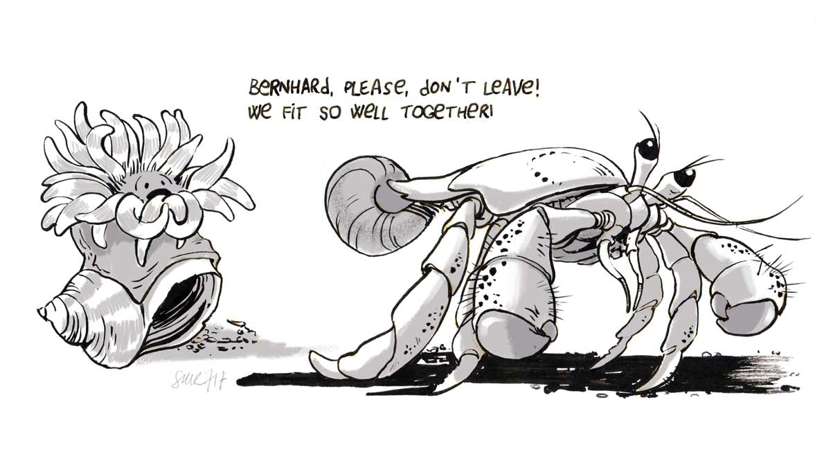 In case zoology is a long way in the past, the hermit crab finds and inhabits shells from other animals and often carries a sea anemone around in what is supposed to be a mutually beneficial relationship....