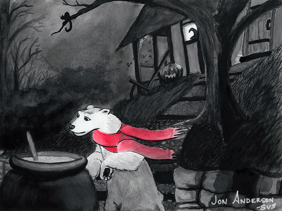 "Christmas Misadventure" This jolly bear found an unexpected experience when he ventured too far from Christmasland. Created with ink and watercolor.