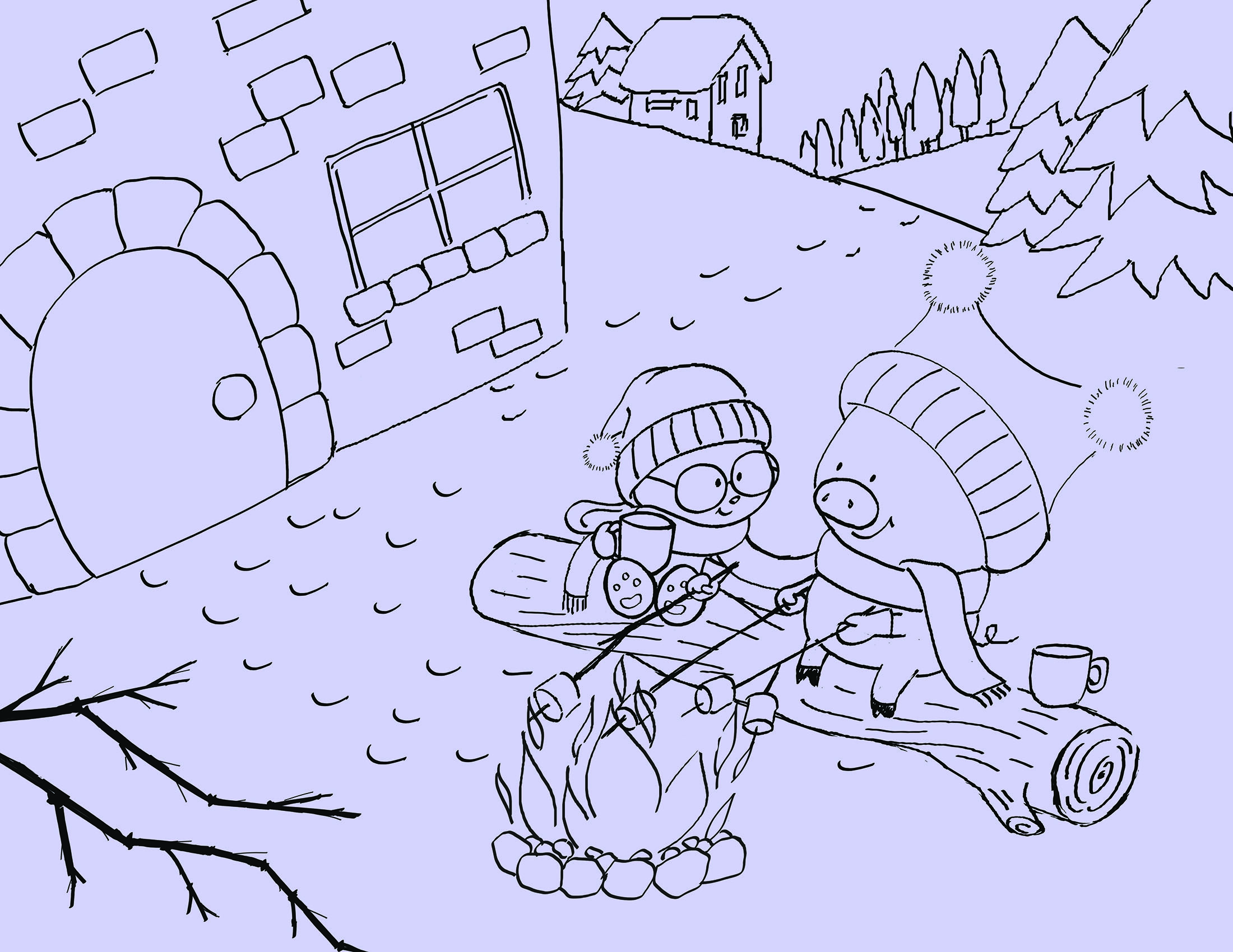@lisanganart The composition is very cute and heartwarming. I do see a couple of tangents, one between the pig’s Pom Pom and the tree, and one with the branch touching the edge of the page. The perspective of the window on the house is slightly off on the right side.