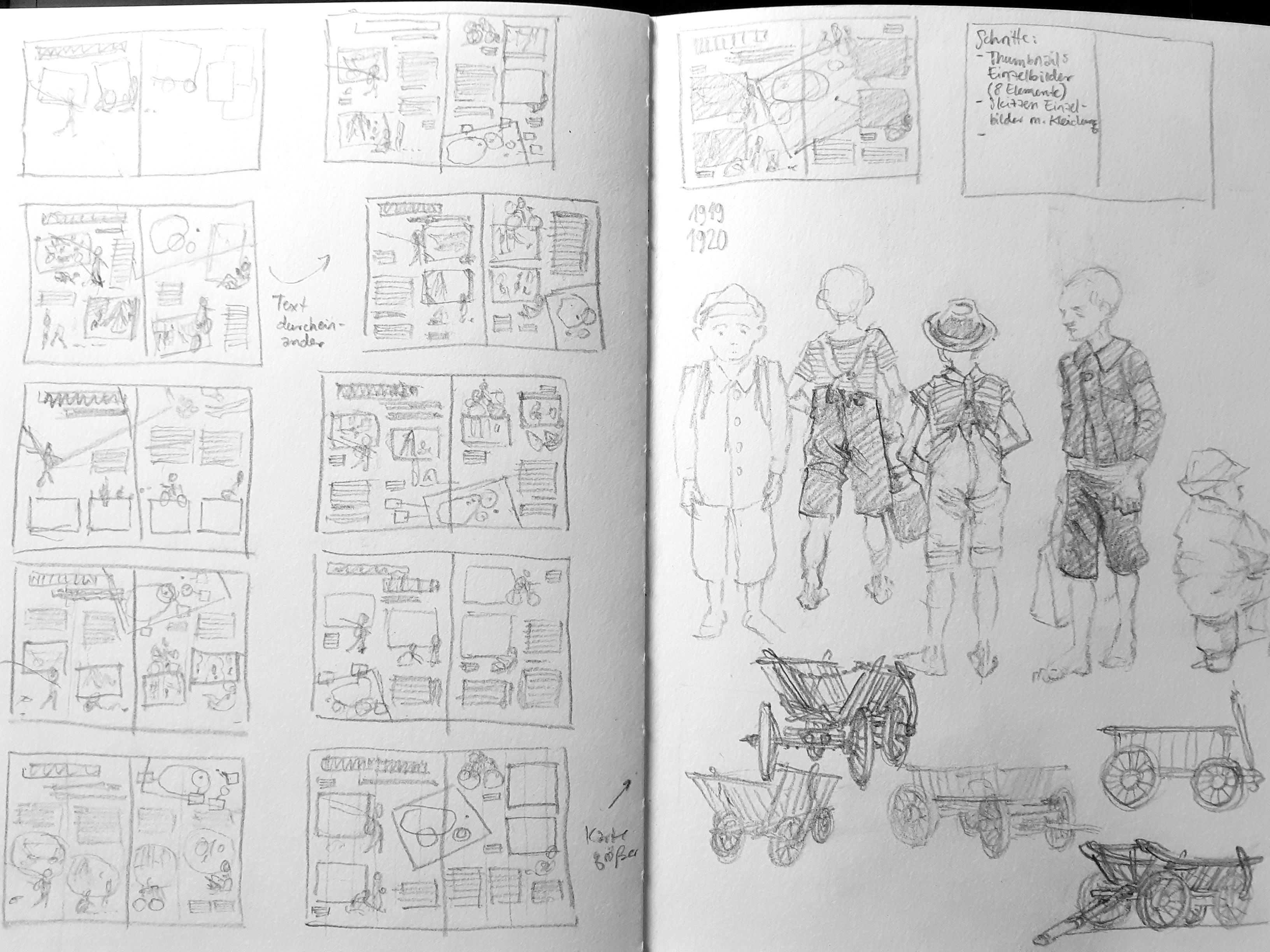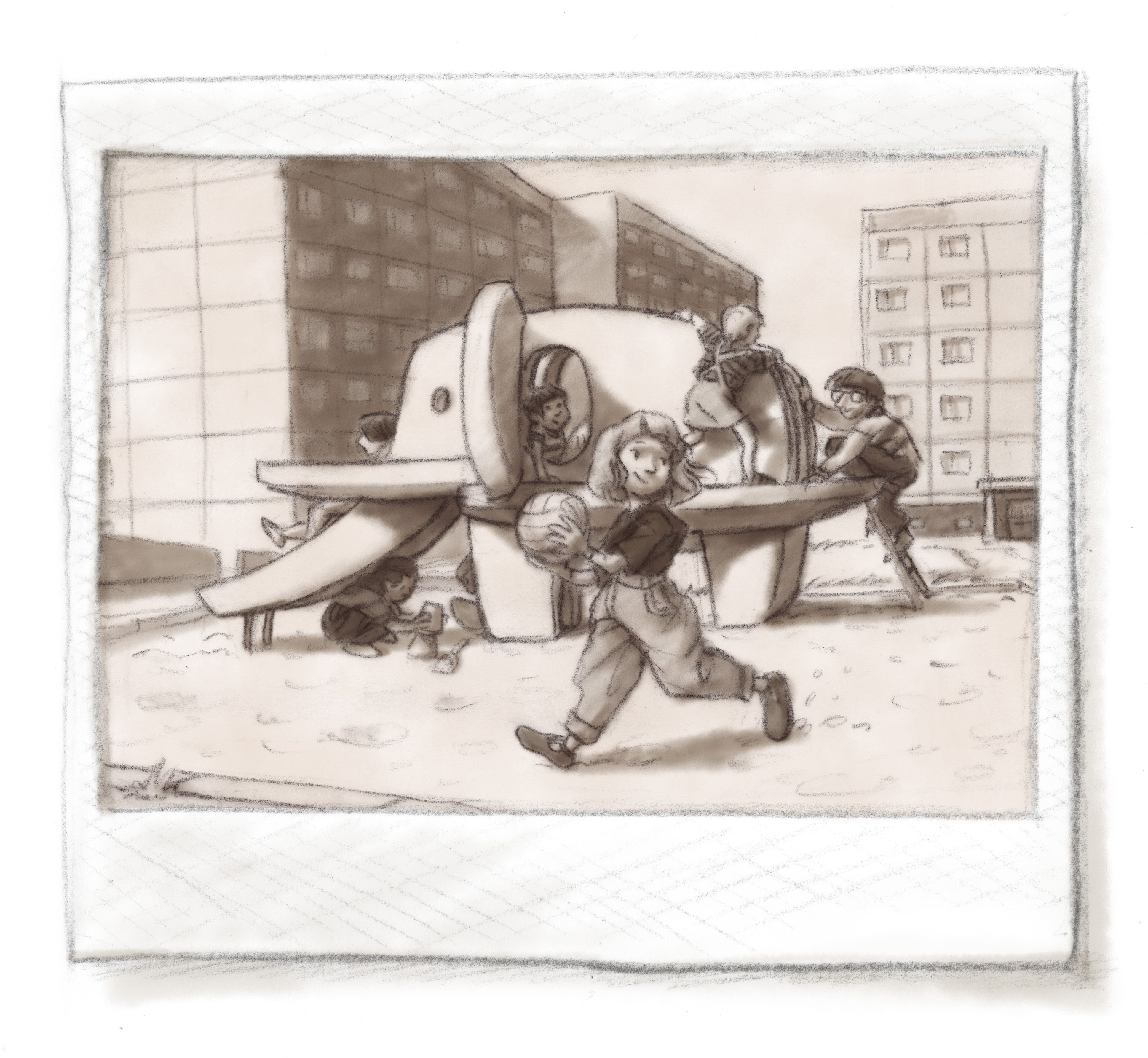 For each of the four periods, I've picked one scene with kids playing, which will be drawn either in a sort of album photo in the air of its time. And, second, a child on his way to some activity typical in that time.