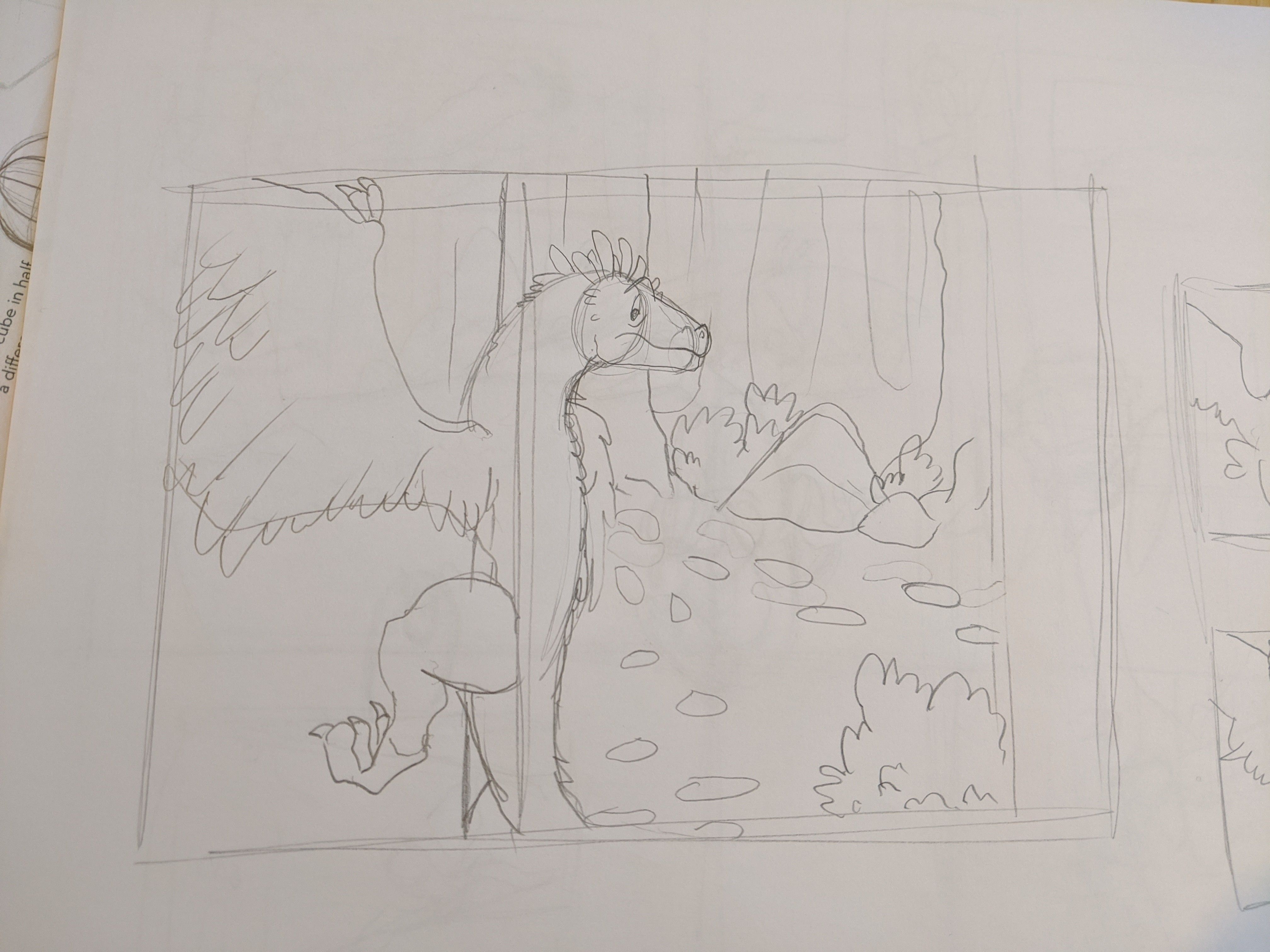 I joined these forums just yesterday and this morning found this month's illustration topic and thought I'd join in even if I get a late start. My take on the prompt see's Will as a feathered Microraptor clinging to a tree trunk looking down at some human fooprints. Originally there was quite a bit of open space but I've moved the two trees at the the side closer together to help direct the viewers eye a bit. I also can't decide on where I want the track to be leading which is why there are two set of tracks marked out. These are rough pencils and I wanted to take the opportunity to get some opinions and advice/critiques before I move forward. So what do people think ???