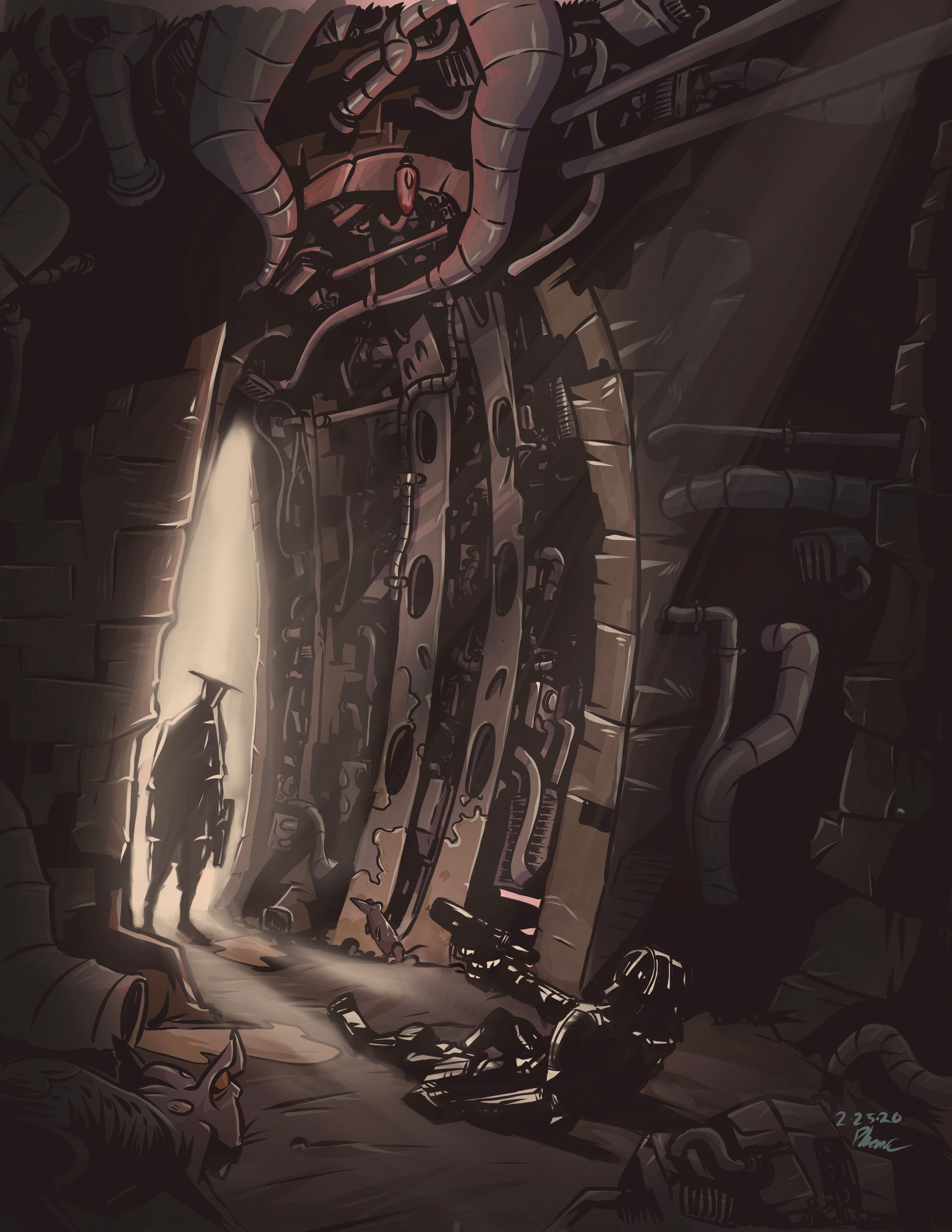 @carolinedrawing So the story is there is these ground of people called the Foryn. They are believed to be descendants of this entity called Morke. There’s this huge backstory and everything, but that’s not important. The guy standing in the entrance is a bounty hunter called Ronan. His mom was killed by the Foryn when they raided his village. Later they stole his child, the only thing he had left. After that he swore to find his child and kill every Foryn he sees. The guy in the foreground is a Foryn who was stationed in this tunnel while they were exporting raw kemonite from this planet called Eran on the kemorim. Kemonite is a rare ore only found on the kemorim, it’s used to make military grade armor and vehicles. So this guy who lives on Eran hunts down these Foryn soldiers who are stationed in the tunnel.