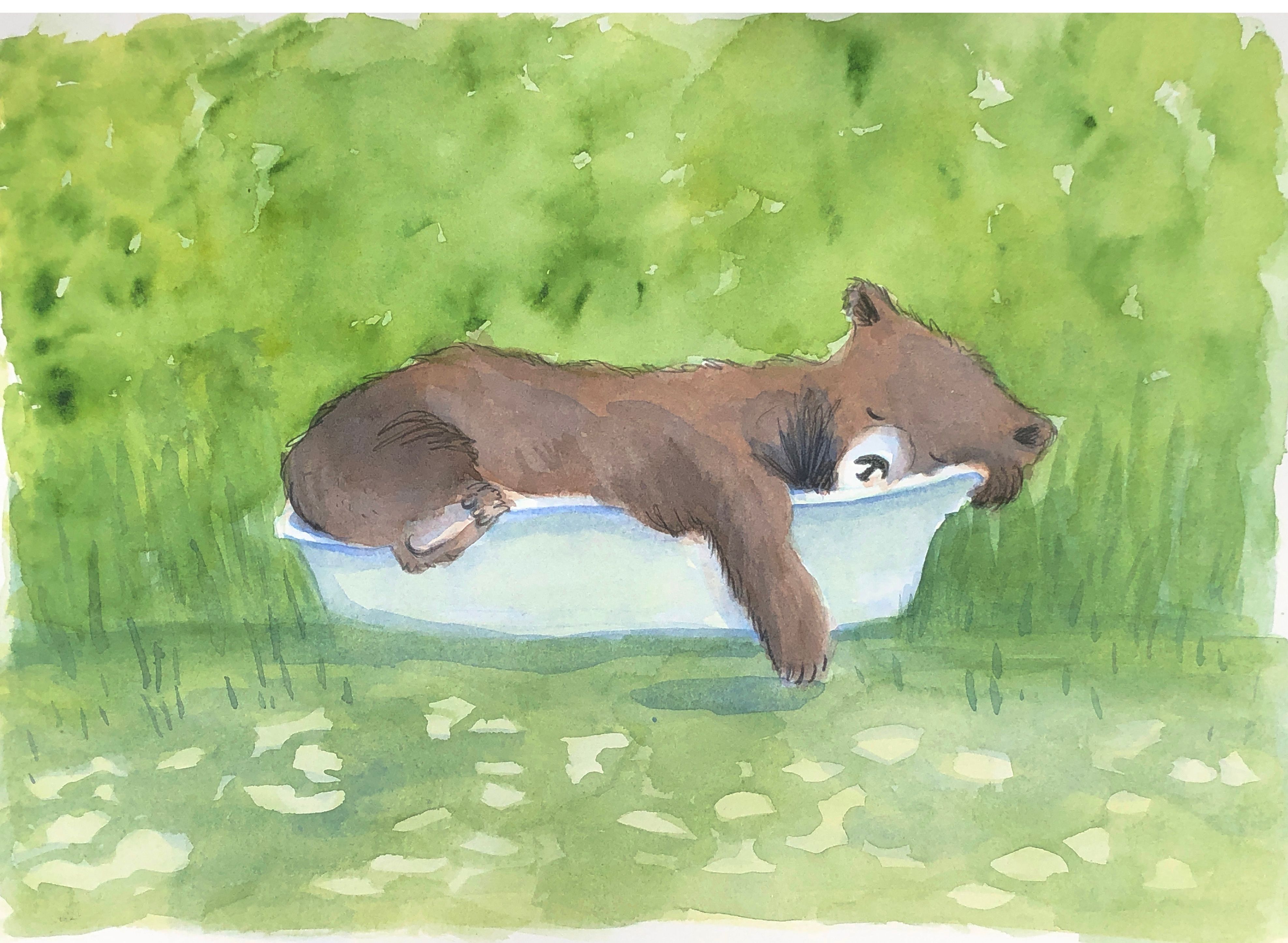 @Jewels It's a charming bear! To stop the tub from looking like it is floating could you perhaps add some grass stalks around the very edges of it to show it is "grounded" and perhaps add a bit more of a shadow, depending on where your light source is positioned? Agree that it would perhaps be best to play with it digitally if you have the ability!